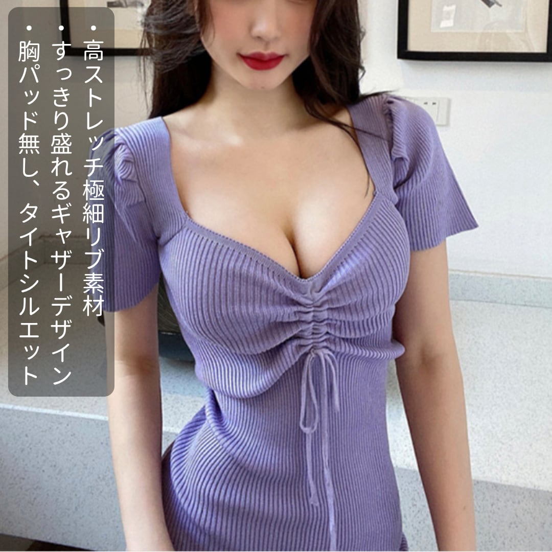 タイトなリブニットが体にフィットし、着痩せ効果で美しいボディラインを強調。