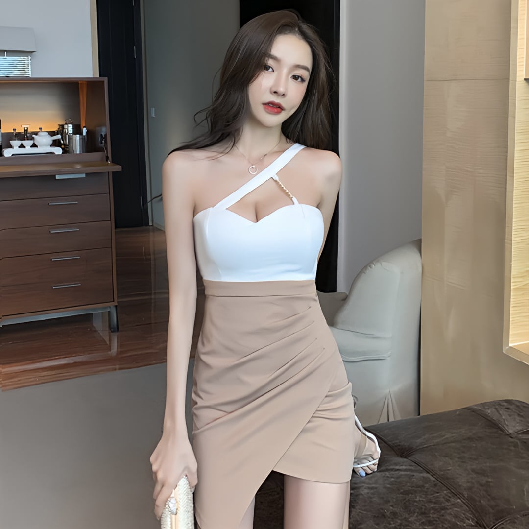 左右非対称アシメトリーのワンショルダーが大人びた印象のシンプルカラーのミニドレス。