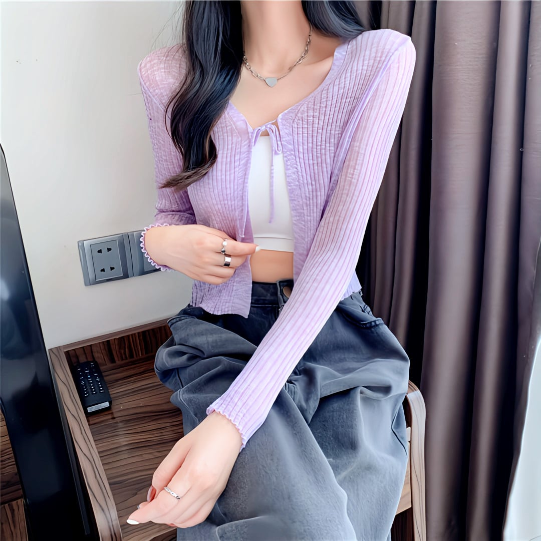 絶妙なシアー感が上品な雰囲気を醸し出すシアーカーディガン。