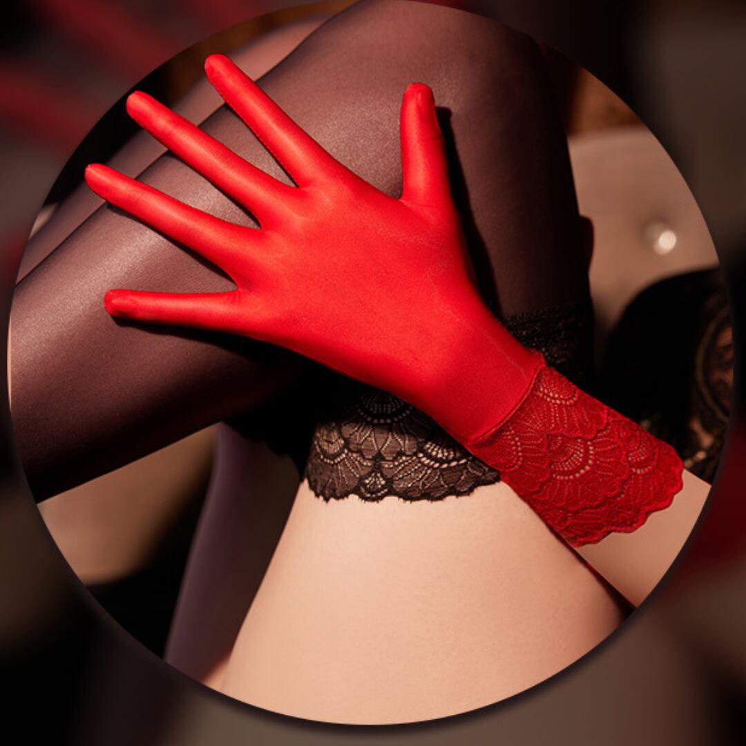キメの細かい高弾性ストッキング生地を使用した淡い光沢のある手袋。